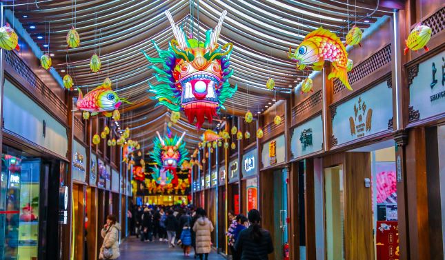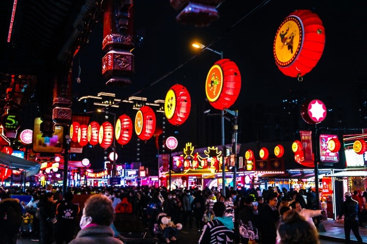 豫园商城中心广场高约9米的“虎跃东方”生肖灯组尤为壮丽。华宝楼墙面,一幅“千里江山图”徐徐展开,写就“百年恰是风华正茂”图卷,呼应巍峨的虎灯。“天官”携五仙在豫园为市民游客们送上浓浓中国味的吉祥祝福。非遗灯彩齐齐点亮,以“张灯”的形式,为游客提供赏灯纳福的美好氛围。