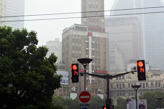▲暴雨期间,南京路步行街室外温度计显示实时气温骤降至23℃。