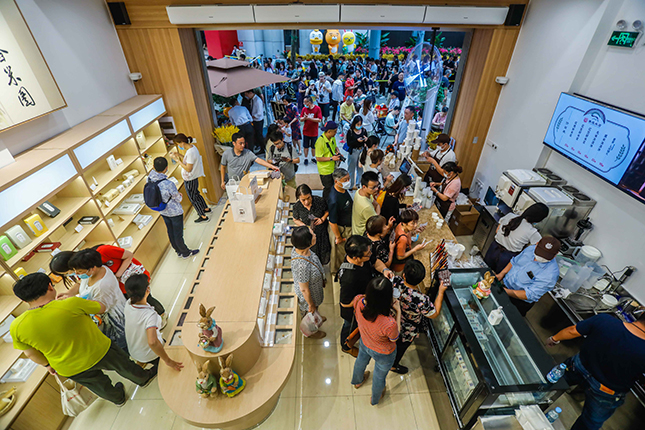 ▲有着百年历史的黄隆泰这家新店主打“潮品花茶”,还没进店就能闻到一股花果香。
