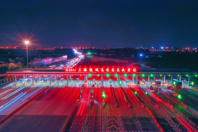 晚上8点45分左右,记者在高东收费站看到前往崇明方向的拥堵缓行车辆绵延数公里,无数的车灯汇聚成一条明亮的长龙。