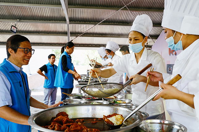 国庆中秋双节当日,上午10点30分,200余位国庆留守一线的建设者陆续来到徐汇滨江建设者之家,党员志愿者为建设者们送上热气腾腾的“国庆面”。