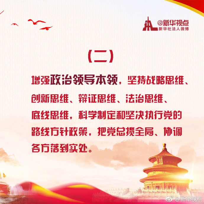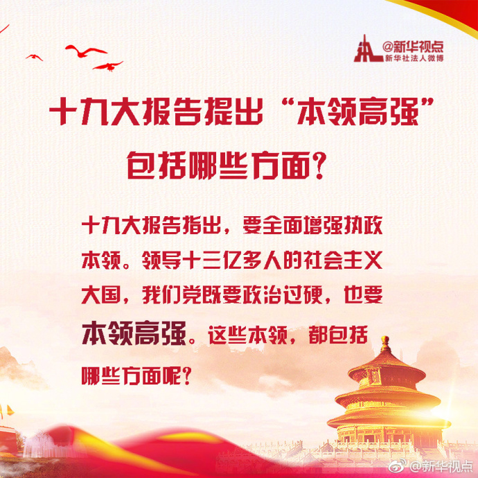 新华网北京10月19日电 十九大报告提出,领导十三亿多人的社会主义大国,既要政治过硬,也要本领高强。全面增强执政本领,方法都在这里!(据新华社“新华视点”微博)