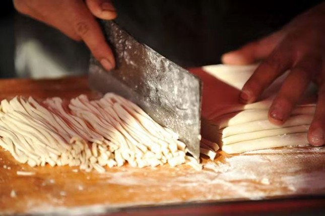 不同于其它面条,“次坞打面”关键在一个“打”字。面点师傅用一根长得有点夸张的擀面杖,将面团反复打压成薄薄的面皮,再折叠起来切出面条。每一碗面都经过上千次反复折叠打压,面的韧劲正是源于对面团的“千锤百炼”,这种做法使面条极富韧性,口感爽弹。同时,一碗面好不好,最重要的是看汤,很多浙江人吃面前先喝一口汤,汤对了,面也八九不离十了。次坞打面带着浙江面的“鲜”气,以秘制的高汤做底,不加一点味精。