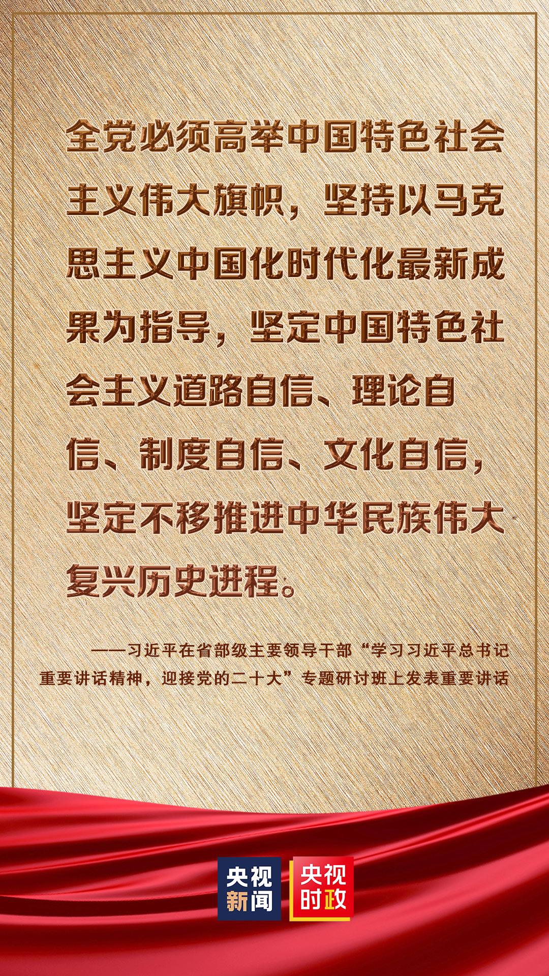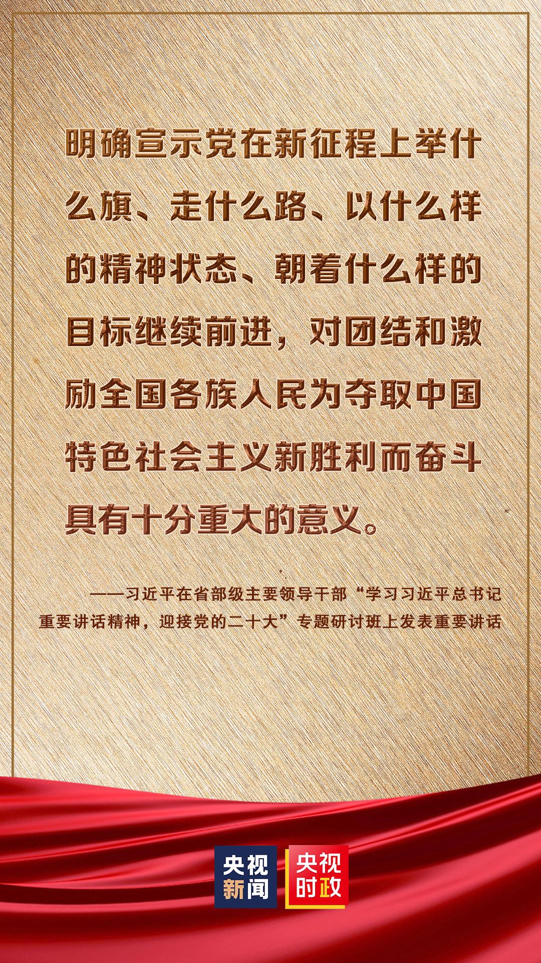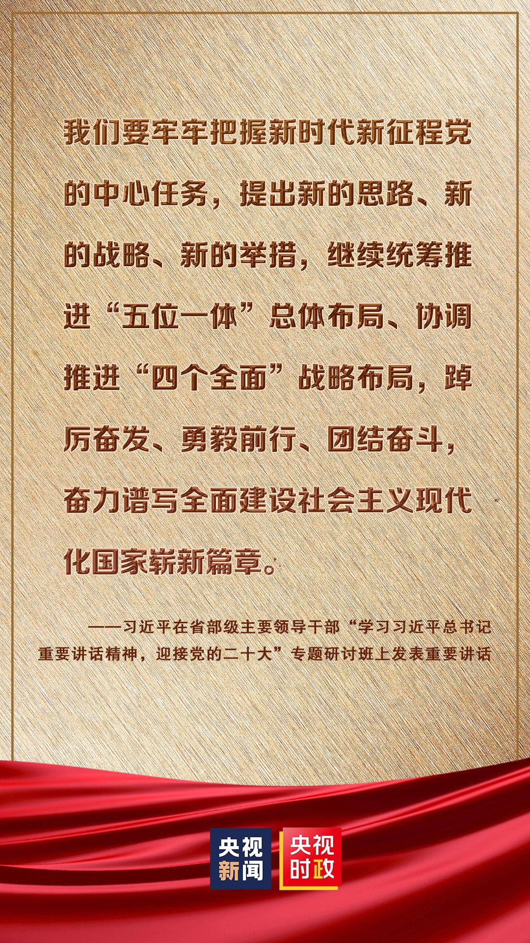 省部级主要领导干部“学习习近平总书记重要讲话精神,迎接党的二十大”专题研讨班26日至27日在京举行。中共中央总书记、国家主席、中央军委主席习近平发表重要讲话强调,在全面建设社会主义现代化国家、向第二个百年奋斗目标进军的新征程上,全党必须高举中国特色社会主义伟大旗帜,坚持以马克思主义中国化时代化最新成果为指导,坚定中国特色社会主义道路自信、理论自信、制度自信、文化自信,坚定不移推进中华民族伟大复兴历史进程。我们要牢牢把握新时代新征程党的中心任务,提出新的思路、新的战略、新的举措,继续统筹推进“五位一体”总体布局、协调推进“四个全面”战略布局,踔厉奋发、勇毅前行、团结奋斗,奋力谱写全面建设社会主义现代化国家崭新篇章。