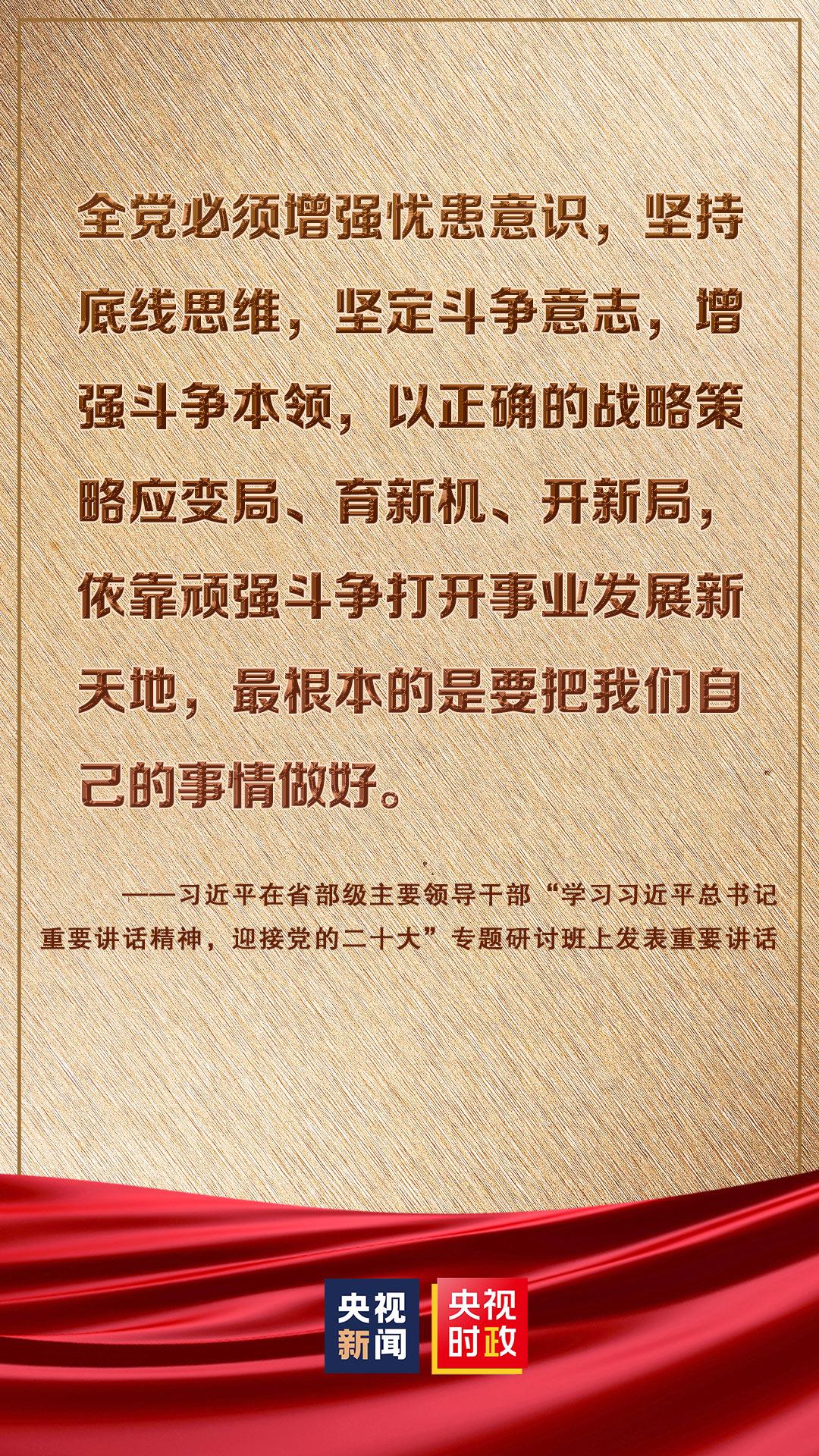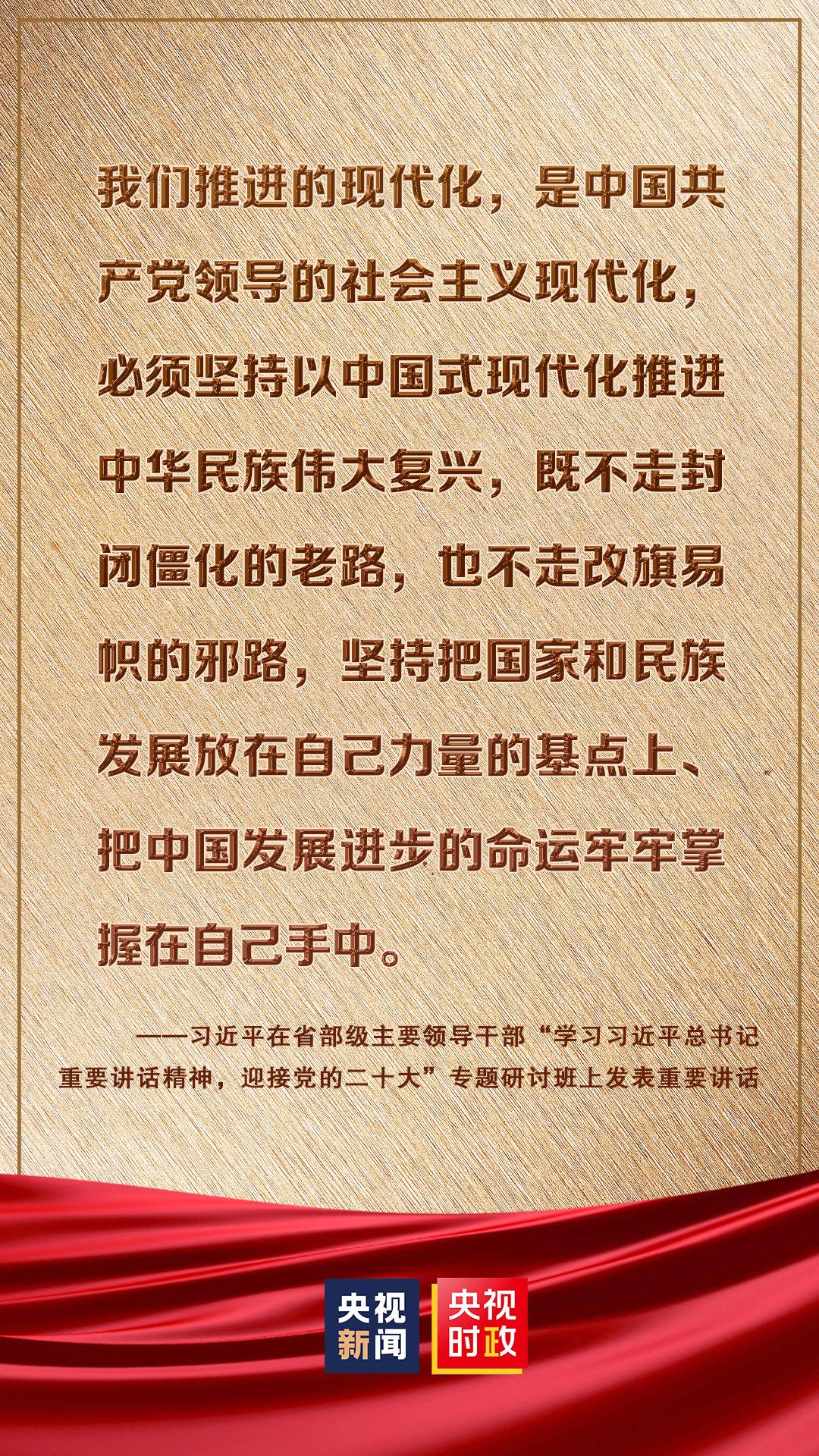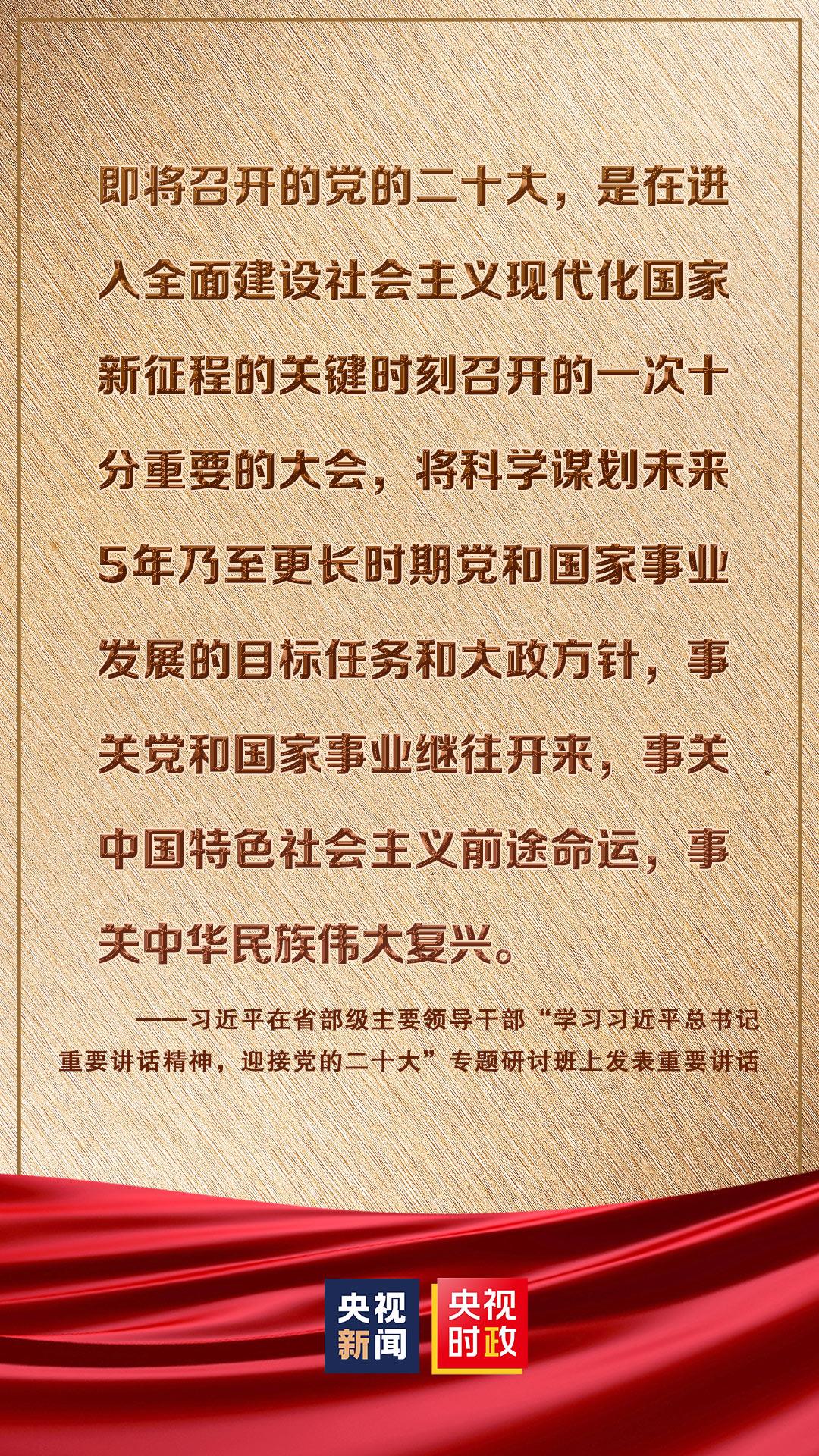 省部级主要领导干部“学习习近平总书记重要讲话精神,迎接党的二十大”专题研讨班26日至27日在京举行。中共中央总书记、国家主席、中央军委主席习近平发表重要讲话强调,在全面建设社会主义现代化国家、向第二个百年奋斗目标进军的新征程上,全党必须高举中国特色社会主义伟大旗帜,坚持以马克思主义中国化时代化最新成果为指导,坚定中国特色社会主义道路自信、理论自信、制度自信、文化自信,坚定不移推进中华民族伟大复兴历史进程。我们要牢牢把握新时代新征程党的中心任务,提出新的思路、新的战略、新的举措,继续统筹推进“五位一体”总体布局、协调推进“四个全面”战略布局,踔厉奋发、勇毅前行、团结奋斗,奋力谱写全面建设社会主义现代化国家崭新篇章。