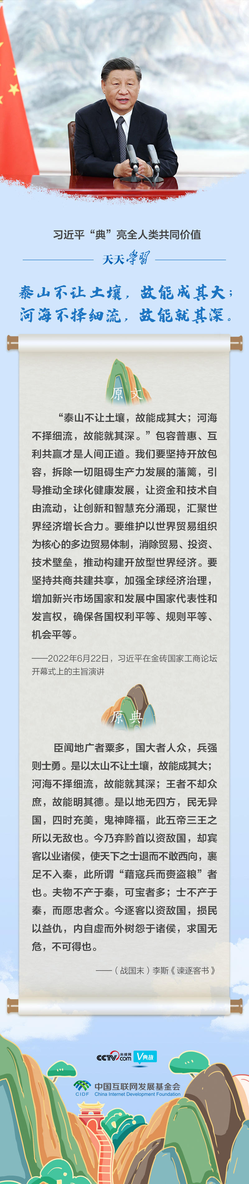 一段时间以来,一些国家想实行“脱钩断链”,构筑“小院高墙”。国际社会普遍担忧世界经济将分裂为相互隔绝的区域。面对经济全球化遭遇的“逆风逆流”,习主席把握大势,拨云见日,撷取古语“泰山不让土壤,故能成其大;河海不择细流,故能就其深”,强调经济全球化是生产力发展的客观要求和不可阻挡的历史潮流。开历史倒车,企图堵别人的路,最终只会堵死自己的路。