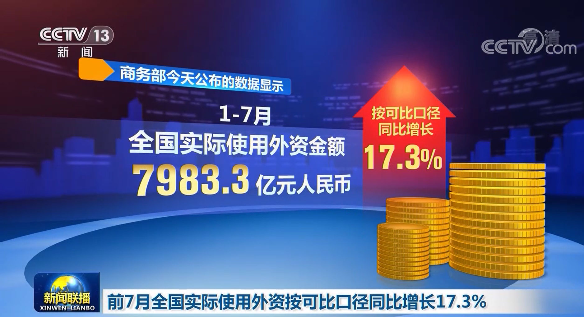 央视网消息(新闻联播):商务部今天(8月18日)公布的数据显示,1—7月,全国实际使用外资金额7983.3亿元人民币,按可比口径同比增长17.3%。