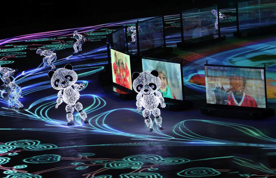 △“北京8分钟”,智能机器人控制着“冰屏”与24名轮滑演员,配合地面投影不断变幻曼妙舞姿。