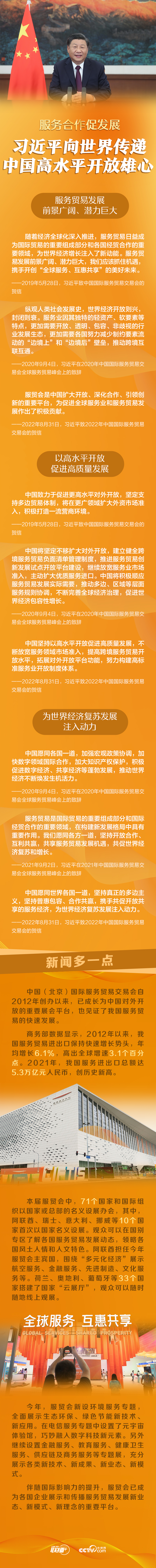 8月31日,国家主席习近平向2022年中国国际服务贸易交易会致贺信。多年来,习近平主席高度关注中国服务贸易发展,提出多项举措,持续推动中国实施更大范围、更宽领域、更深层次的对外开放。