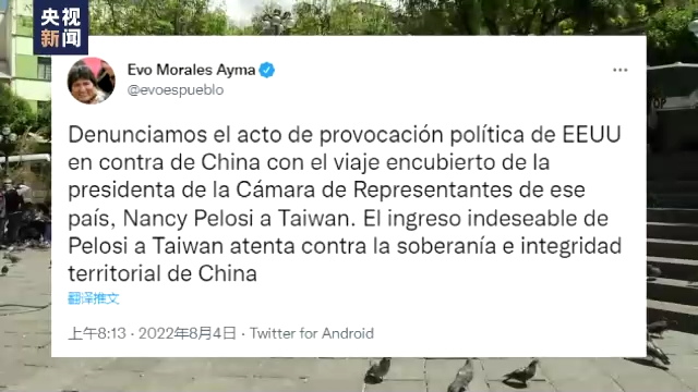 玻利维亚争取社会主义运动主席、前总统莫拉莱斯4日在社交媒体发文谴责美国国会众议长佩洛西窜访中国台湾地区,他表示这是美国针对中国的政治挑衅,并谴责这一侵犯中国主权和领土完整的行径。