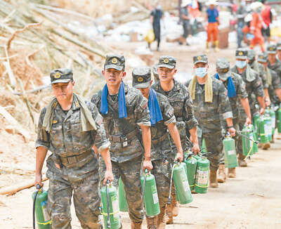 救援人员提着灭火器前行。