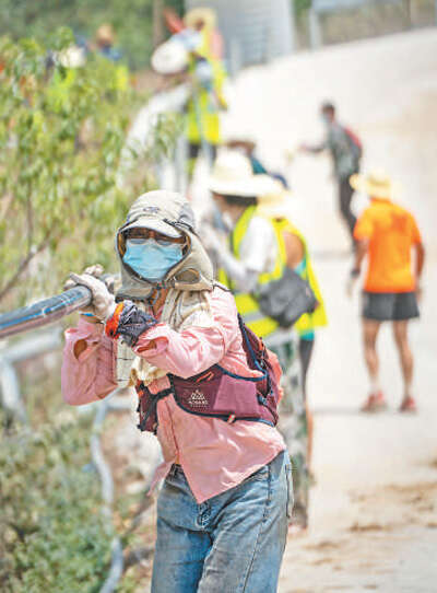志愿者在铺设输水管道。