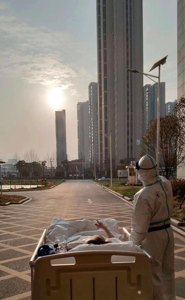 刘凯是中山医院的医生,27岁,在武大人民医院东院支援。3月5日下午4点多,他护送病人去做CT检查随访,路上看到阳光很好,就停下来,让住院近一个月的87岁的重症患者欣赏日落。老人说,夕阳蛮好。