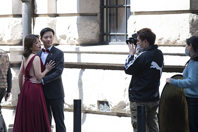 上午,记者在外滩看到,此前略显空荡的马路上已多了不少游客,不少新人也赶在春光明媚、气温适宜的时间来此拍摄婚纱照。