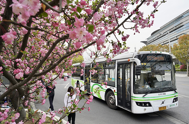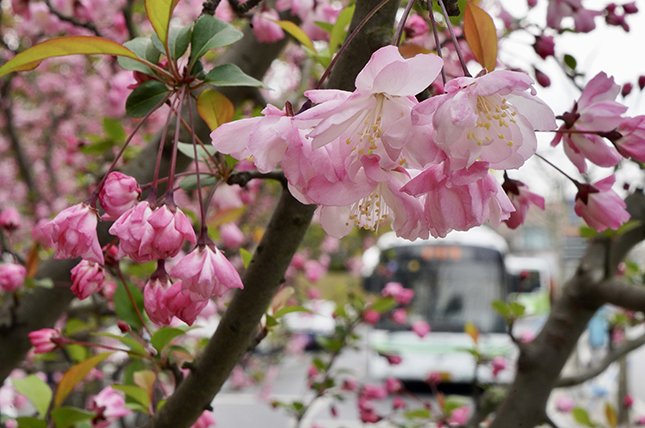 位于苏州河畔的公交757路光复西路大渡河路终点站旁的海棠花争相含苞待放,吸引了不少等候公交车和路过的市民驻足拍照,记录春天的美好。