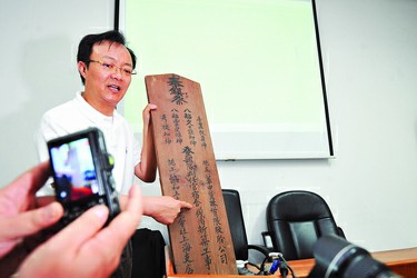 复旦大学档案馆馆长展示当年日军在复旦校区附近新建澡堂时立的奠基牌。 本报记者 叶辰亮摄