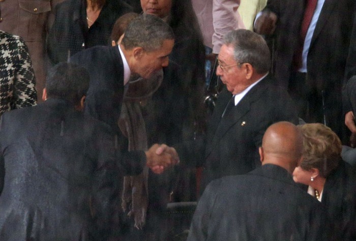 2013年12月,美国总统奥巴马在南非出席曼德拉追悼大会期间与古巴领导人劳尔•卡斯特罗握手寒暄。