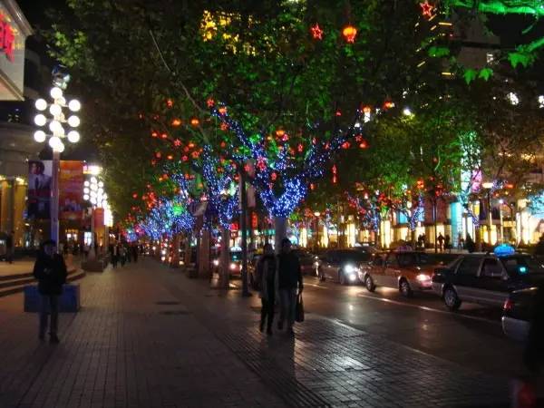 街道两旁的大树上挂着密密麻麻的小灯笼,红红的微光点缀其间,使这里的风景显得更加的妩媚。