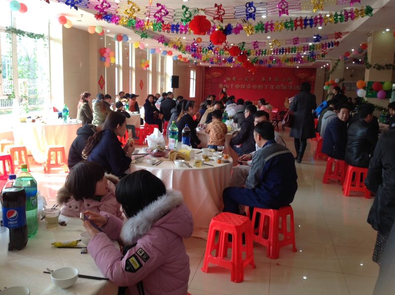 和去年一样,工业区永盛包装来自四川的刘浩没有回家过年。不一样的是,在这一年的时间里,他已经娶妻生子。妻子和丈人丈母娘都在一个厂工作,为了更好的照顾才满月不久的小孩,今年一家五口人都留在了金山。在企业聚集的金山工业区,像刘浩这样,没能回家的职工有不少。企业里的机械不能停产、生产流水线必须有人监管、回家的路途遥远而车票没有买到……这些种种因素都是跟他们一样没有回家的原因。但是,虽然没有回家,在这里他们依然能跟“亲戚”们团聚,共享“年夜饭”热闹欢庆的年味。