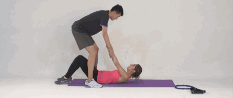 1.一人躺在地上,膝盖弯曲,脚后跟着地。