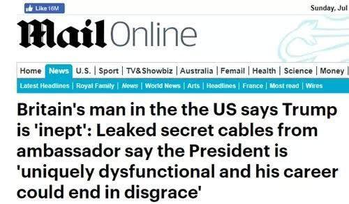 英国《每日邮报》6日曝光了英国驻美大使金·达罗克发送给英国外交及联邦事务部(FOC)多封秘密电报和备忘录,在电报中,达罗克对特朗普的评价非常不高,甚至用上了“不安全”、“无能”等字眼。