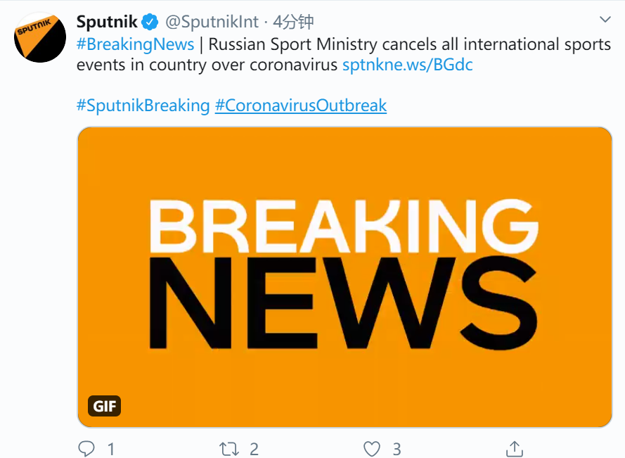 俄罗斯卫星通讯刚刚报道称,受新冠肺炎疫情影响,俄罗斯体育部取消了国内所有国际体育赛事。