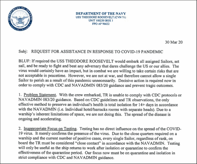 “罗斯福”号舰长的信件:1. 空间有限,传播加剧;2.新冠测试作用有限。一旦船上出现确诊病例,每一位舰员都是“密切接触者”,当务之急是解决隔离问题。