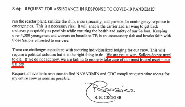 综合美国媒体报导,前“西奥多·罗斯福”号舰长克罗泽因船内发生大规模群聚感染写信向美国海军高层求助,要求让船员下船检疫。《旧金山纪事报》在上月31日率先披露克劳齐致函求援,让外界知悉航舰内部状况,尽管成功争取船员离舰检疫,但事后美国海军代理部长宣布克罗泽尔被撤职,原因是“判断失误”,夸大舰上疫情的严重性,也未能正确反映舰上实情,造成不必要恐慌。