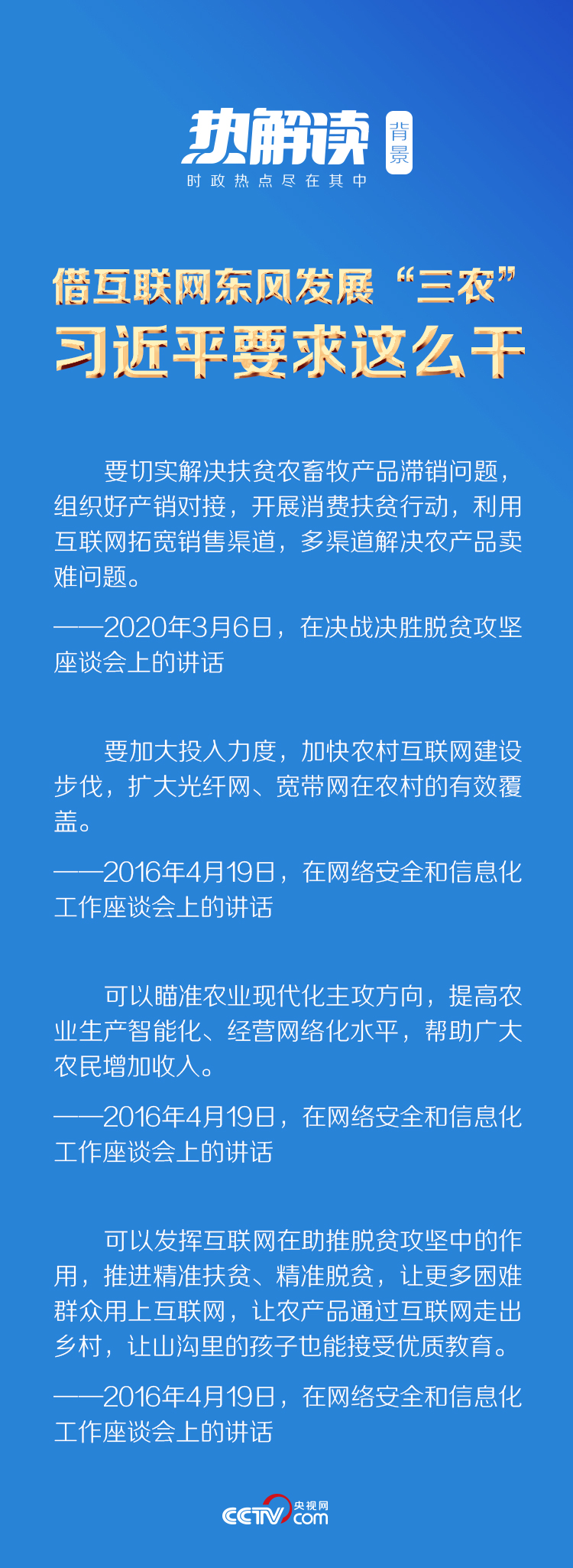 “可以瞄准农业现代化主攻方向,提高农业生产智能化、经营网络化水平,帮助广大农民增加收入”“可以发挥互联网在助推脱贫攻坚中的作用,推进精准扶贫、精准脱贫”……习近平从方方面面提出要求。