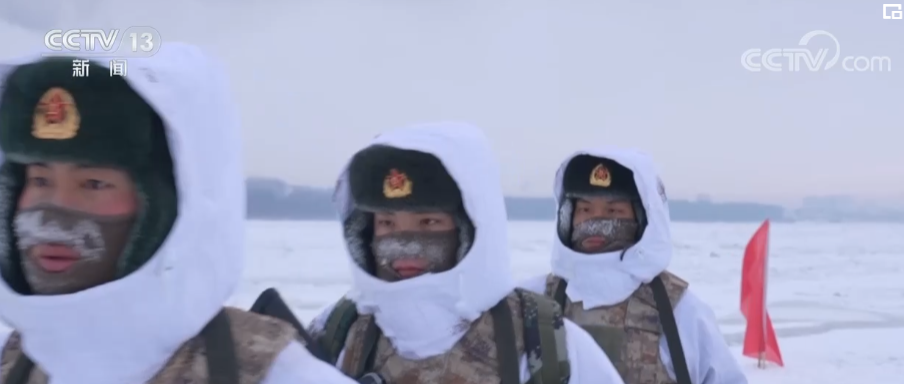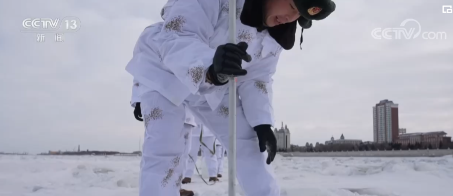 巡逻小组需要前往管控区内最边远的地方查询边境情况,伴随着冷空气的来临,界江江面的温度低达零下36摄氏度,江面冰层崎岖,没一会儿,战士们的脸就被江风吹得通红,护具上也都结上冰碴,他们每天要在这样的环境下巡逻将近4个小时。除了要面对极寒,考验他们的还有江上的路。每到冬季,江面都会有没完全冻结的清沟,表面被大雪覆盖,不易被发现。为避免发生坠江事故,官兵都会在江中心逐点检测冰层厚度,开辟安全的执勤通路。