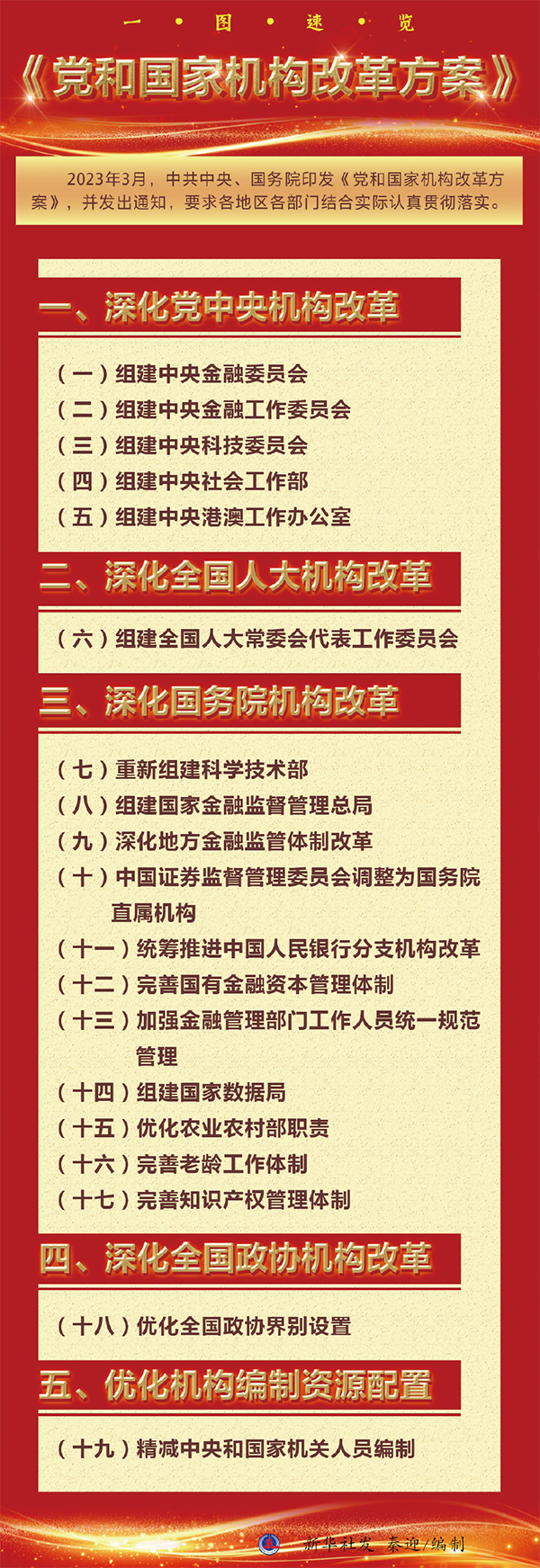 2023年3月10日上午9时许,北京人民大会堂大礼堂。2900多名全国人大代表按下表决器,十四届全国人大一次会议表决通过了关于国务院机构改革方案的决定,批准了根据《党和国家机构改革方案》形成的国务院机构改革方案。6天后,《党和国家机构改革方案》全文公开发布,向着强国建设、民族复兴的宏伟目标,党和国家机构改革扬帆破浪启新程。