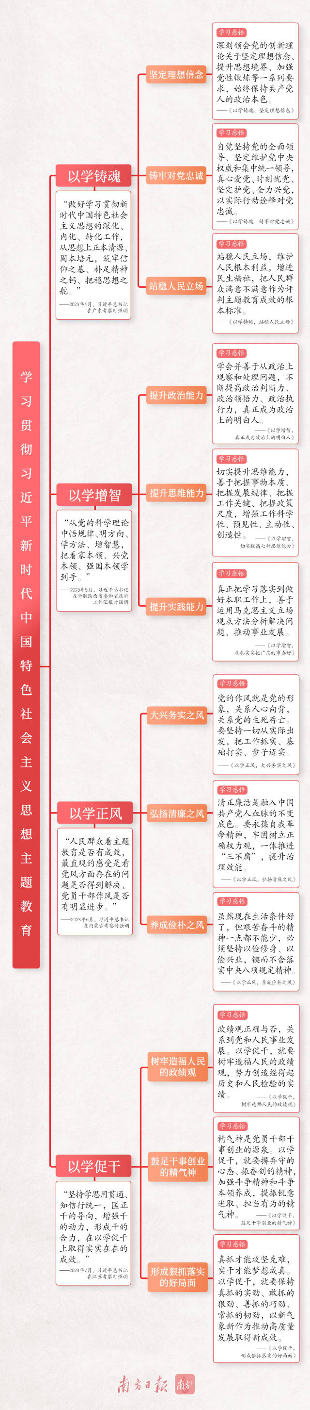 学习贯彻习近平新时代中国特色社会主义思想主题教育正在全党深入开展。2023年4月到7月,习近平总书记在广东、陕西、内蒙古、江苏四次调研中,分别对“以学铸魂”“以学增智”“以学正风”“以学促干”提出明确要求,一起来看思维导图学习重点↓↓