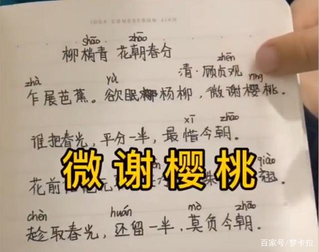 而让这名7-8岁小男孩为难的那句就是,“微谢樱桃”。因为他把这句诗词的意思理解为了“微微地谢谢樱桃”。