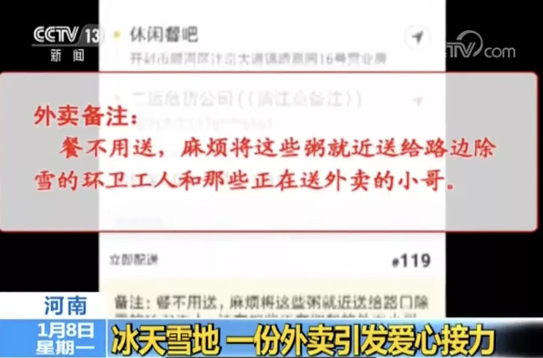 2018年1月29日,四川德阳,一名外卖小哥接到一份没有收货人、没有具体地址的外卖订单,“外卖小哥不用送,这么冷的天自己吃一份,剩下的送给环卫工或者有需要的人。送出去就行。谢谢!辛苦!”