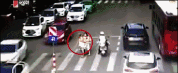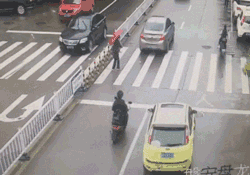 这时,一个小伙推着电动车毅然闯入车流