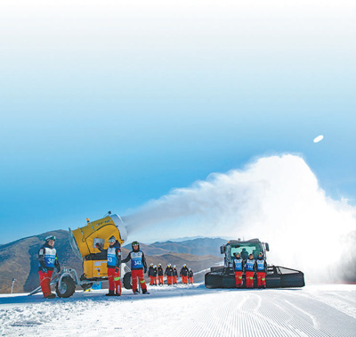 北控京奥滑雪战队正在制雪。延庆赛区国家高山滑雪场中心要在今年10月具备造雪条件。北控京奥滑雪战队选择太舞雪场最陡的雪道作为试验和训练基地,主要任务是记录当时的气温等物理参数,制定一套适用于延庆赛区的雪道制作方法。 |