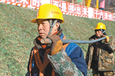 “砰砰砰,砰砰砰……”地下幽深的抗滑桩井道内,3名工人正操作着风镐……张健在准确测量抗滑桩深度的同时,提醒工友们注意施工安全。狭窄的通道上,工友们迈着稳稳的步子,推着装满碎石的小推车向滑道走去。寒风吹拂下,体表温度降至零下12摄氏度,工友们的汗水却一滴滴滑落……