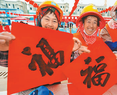 由云南省建设工会和中建二局西南分公司举办的云南省首届工地庙会节上,外来务工人员拿着志愿者刚写好的“福”字,脸上笑开了花。 |