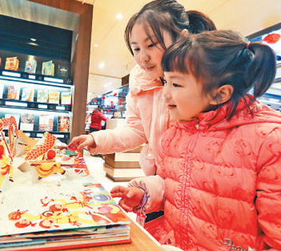 1月28日,重庆沙坪坝书城,小朋友在看年俗立体书。 |