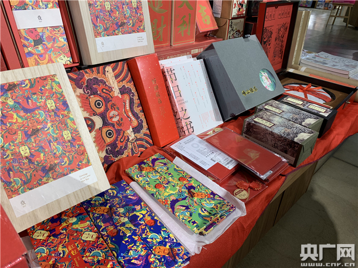 除年画外,现场还展出了不少以年画为灵感来源的周边文创产品:印有门神头像的红包、手账、书签以及行李牌等。(央广网记者 孙冰洁 摄)