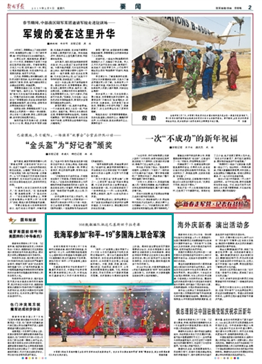“和平-19”多国海上联合军演于2月8日至12日在巴基斯坦卡拉奇及其附近海域举行。演习由巴基斯坦海军倡导组织,旨在促进各参演国海上交流协作,以共同提升应对海上安全威胁的能力。中国、美国、英国、意大利、澳大利亚、马来西亚、斯里兰卡、土耳其和阿曼等国派出舰艇、飞机、特种部队参加,另有巴西等45个国家派观察员观摩。此次联演分为港岸阶段和海上阶段。港岸阶段主要包括召开国际海事研讨会议、反恐反海盗演示、轻武器射击训练和防卫作战演练等,期间还将组织军事研讨交流和文体比赛等多项活动;海上阶段将进行主炮对海实弹射击、反恐反海盗、国际阅舰式等多个科目的演习。