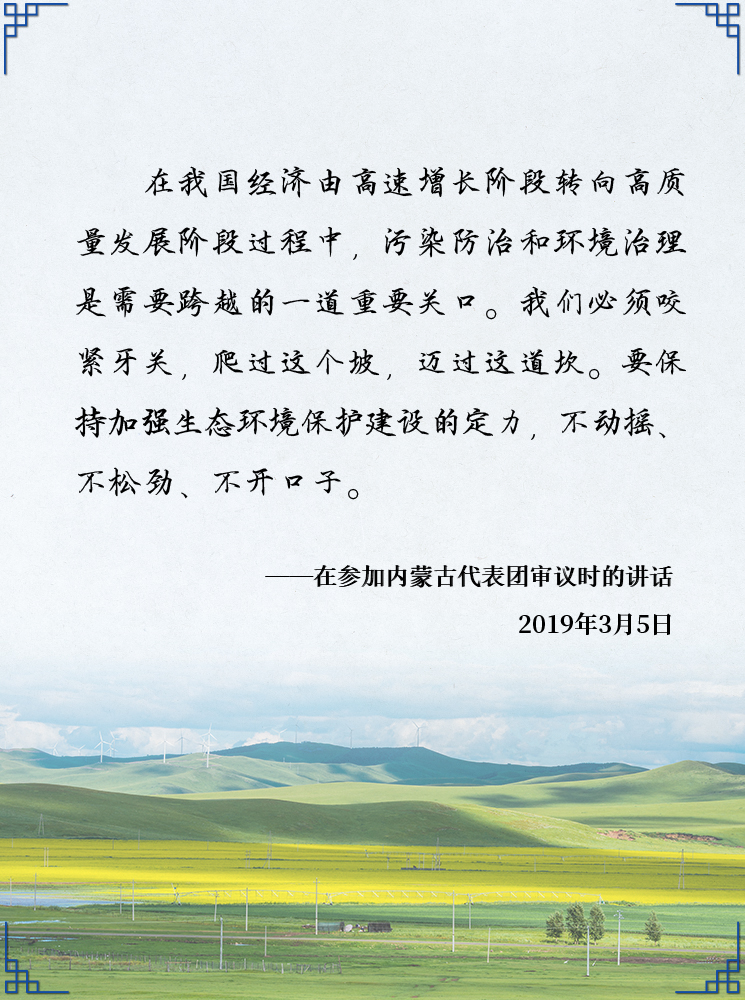 生态环境没有替代品,用之不觉,失之难存。3月5日下午,习近平总书记在参加内蒙古代表团审议时强调,保持加强生态文明建设的战略定力,探索以生态优先、绿色发展为导向的高质量发展新路子,加大生态系统保护力度,打好污染防治攻坚战,守护好祖国北疆这道亮丽风景线。